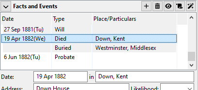 Pedigree Forge supports two types of citations. Firstly, there are citations that are linked to a source. To link a source citation to a fact, locate the relevant fact in the “Facts and Events” table for the relevant person (or one of the couple if it is a couple fact). Click on the fact so that the fact is the current one being edited (its information will appear in the fields below the table):