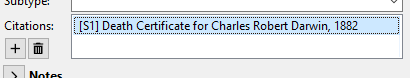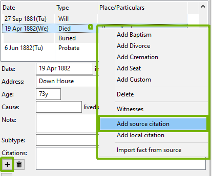 Then, either click on the “+” button below the “Citations:” label, or right-click on the fact in the table and then select “Add source citation” from the pop-up menu.