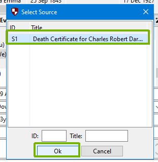 This will pop-up a dialog to allow you to select the source to link to. By default, the source being edited will be selected. Clicking the “OK” button will link the fact to the source, creating the citation.