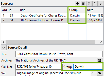 Sources allow a “Group” name to be entered. If we were researching many different branches of our family, we might want to group sources by surname. Group names can be entered in the “Group” field of the source panel, and are shown in the Sources table too:
