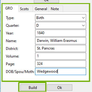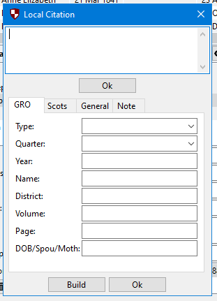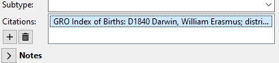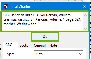 In addition to citations that are linked to a source, it is also possible to create local citations. These are more “light-weight”, than a complete source citation. Perhaps little more than a footnote. I often use these where the only reference is from an index (such as the GRO index of births/deaths/marriage), rather than a full document.