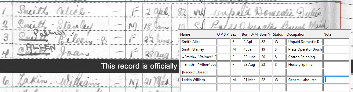An example where this feature might be useful is the 1939 register, which often included later annotations showing married names. It is useful in the transcript to see what was original, and what was added later.