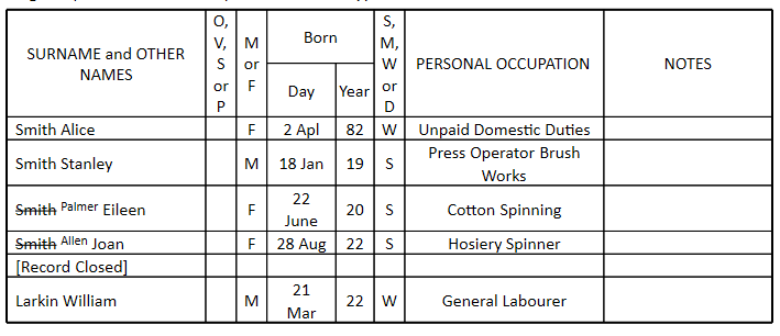 In the following example, Eileen and Joan have married after the 1939 register was taken. We use the strike out (~) and superscript (^) markdown to reflect the original as best as possible: