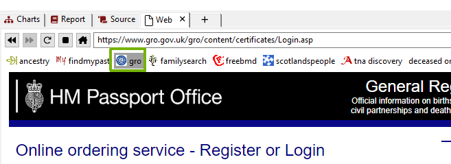 First, we use the built-in web browser to locate the source, in this case, we have used the General Register Office’s site: www.gro.gov.uk. To open the web browser, click on the “+” button on the tabs:
