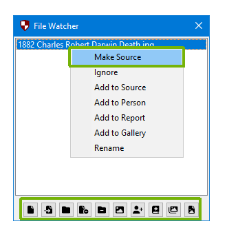 A number of options can be carried out on images in the file watcher, and can be accessed either from the buttons that run along the bottom of the dialog, or by right-clicking a file in the list, which shows a pop-up menu: