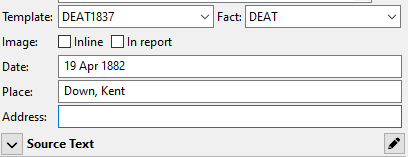 If we select “Make Source”, a new source will be created with the image already linked in and the edit source panel will be shown, ready for you to enter the details. Below we have added the title, linked the archive and set the call number. We have also selected the “Template” as “DEAT1837” (which populates the “Fact” type to “DEAT” automatically). Note: Pedigree Forge uses OCR (Optical Character Recognition) to try and populate the template and fact fields based on the source image, but this isn’t an infallible process, and will sometimes need entering manually.