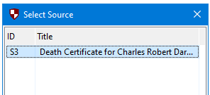 Clicking the “OK” button with the correct source will then import the source, creating the death fact, which already contains the date, place and a citation to the source: