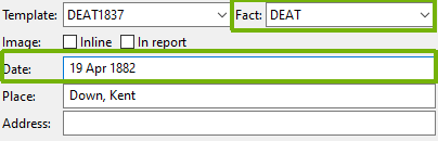 In addition, we are also going to enter the “Date” and “Place” fields this time too. In this particular case, no address is shown (see information on entering dates, places and addresses, elsewhere in the guide).