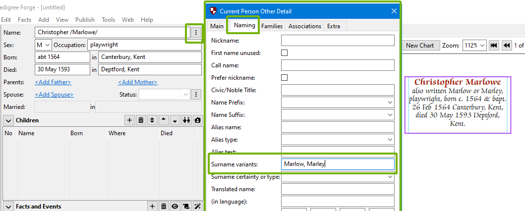 It isn’t uncommon to find an ancestor’s surname written in a variety of ways. These variations are sometimes simple mistakes made by the clerk, but can vary quite a lot on occasions, and it is useful to document them. Christopher Marlowe, for example, had his baptism recorded as Marlow and on one document, signed his name as Marley. If we wanted to record this, we can use the surname variants box, on the “Naming” tab of the Current Person Other Detail dialog: