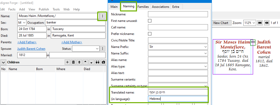 Note: Hebrew is a right-to-left languageāentering text in Hebrew will insert each letter at the left end of the text, which is the opposite of entering English text. This is the only place that Pedigree Forge will handle bi-directional text correctly.