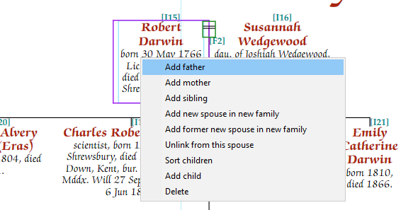 Many editing actions can be done in more than one place. It is often convenient to edit people from the onscreen family charts. To do this, right clicking on someone in the chart (when the chart isn’t in edit mode), will display a pop-up menu with various options: